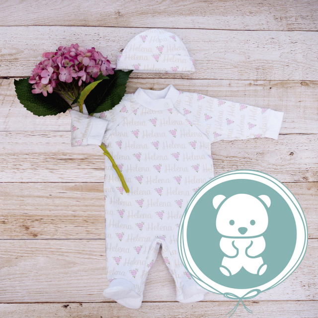 Esta Saída Maternidade é perfeita e delicada! É composta por Macacão e Touca estampados e personalizados com o nome do bebê. Confeccionados em Malha Suedine Jacquard 100% algodão, com toque leve e macio.